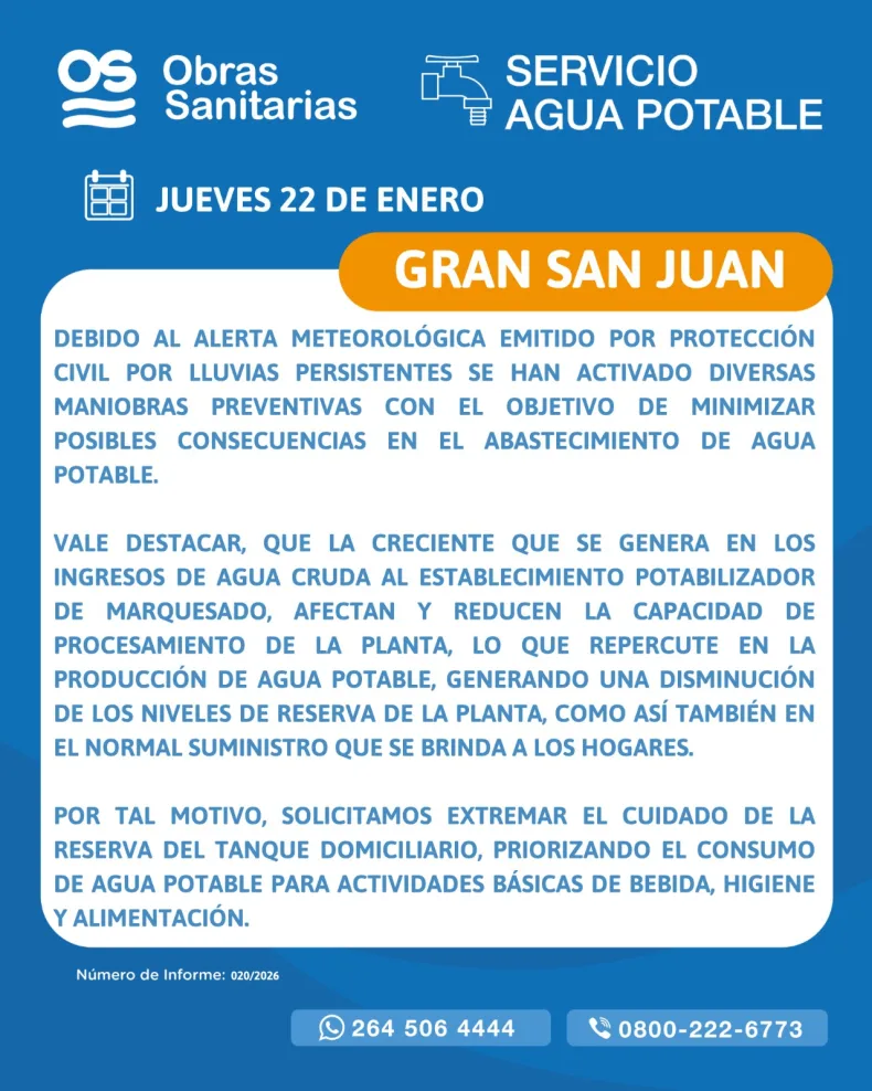 El organismo explicó que el aumento en los ingresos de agua cruda a la planta potabilizadora de Marquesado limita su capacidad de procesamiento, disminuyendo los niveles de reserva y pudiendo afectar el suministro habitual a los hogares.