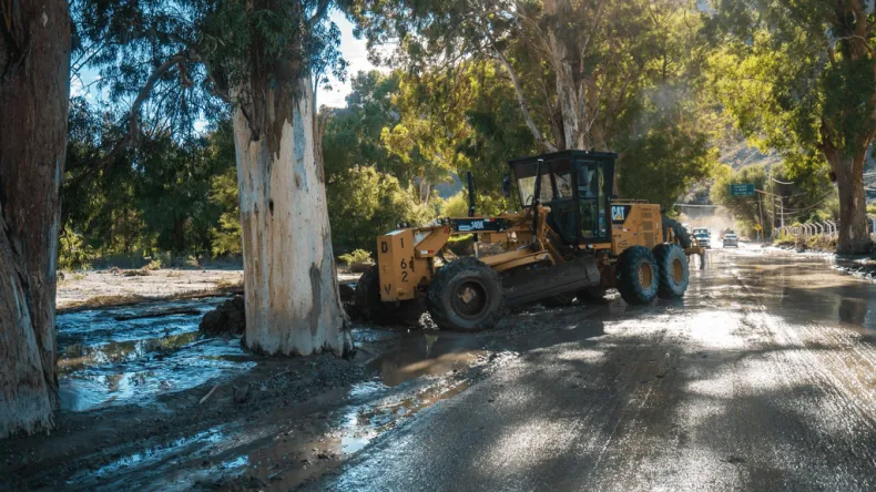 Equipos de Vialidad Provincial y de Hidráulica trabajan coordinadamente para despejar caminos y reforzar defensas afectadas por las precipitaciones en el departamento Zonda.