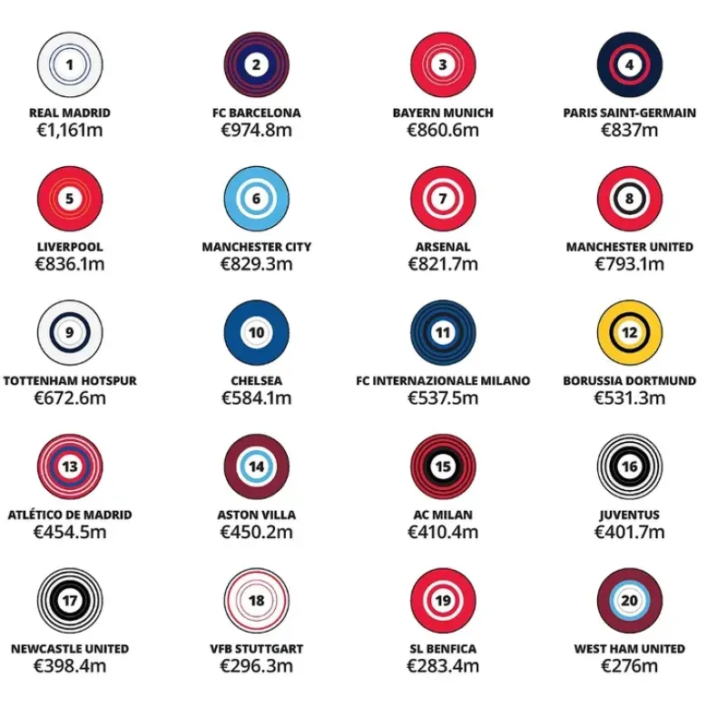 Completan el podio el Bayern Múnich con 860,6 millones, seguido por el Paris Saint-Germain y el Liverpool. La Premier League destaca con varios equipos en el top 10, incluyendo Manchester City, Arsenal y Chelsea.