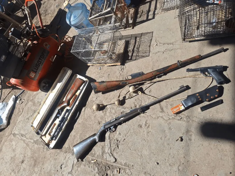 Durante la inspección, la policía encontró 26 cardenales amarillos, un benteveo y otras aves silvestres, además de una carabina tiro a tiro calibre 7,65 mm con cañón de fusil, una pistola semiautomática calibre .22, otra carabina calibre .22 largo y municiones de distintos calibres sin la documentación legal exigida.