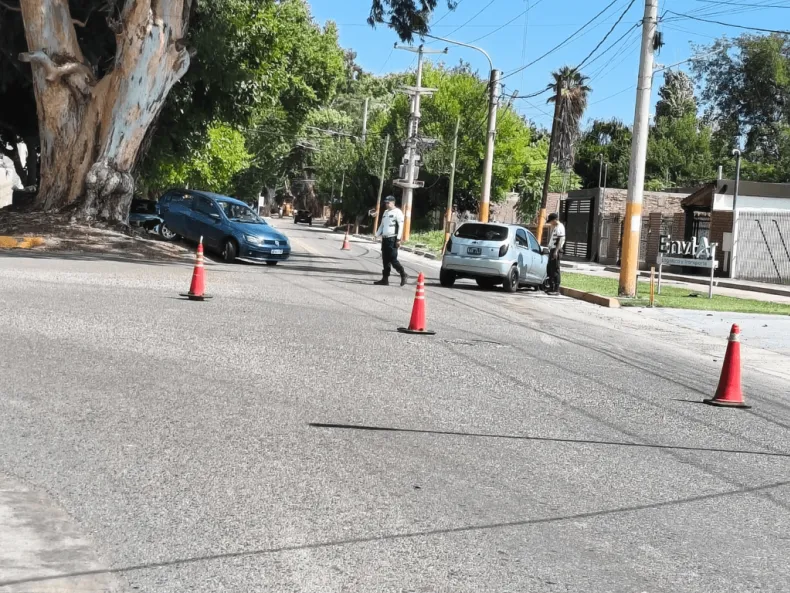 Un Chevrolet y un Volkswagen colisionaron en la intersección de Hipólito Yrigoyen y Belgrano, frente a una empresa de logística, provocando daños materiales y la intervención policial.