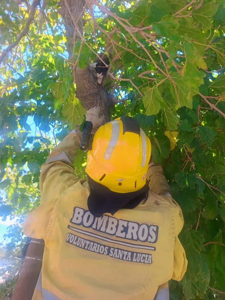 Una situación de angustia se transformó en alegría la tarde del lunes en Santa Lucía, cuando los Bomberos Voluntarios rescataron a un pequeño gato que permanecía atrapado en la copa de un árbol.