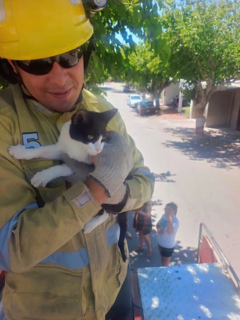 El incidente ocurrió alrededor de las 14 horas en el barrio Vildo III, cuando una vecina alertó al Cuartel N°5 por la imposibilidad de su mascota para descender del árbol. El felino, un macho de apenas cinco meses y pelaje blanco y negro, estaba asustado y causó preocupación en su dueña.