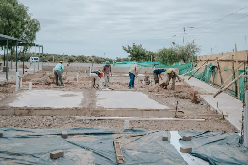 Se avanza en la construcción de la Unidad Rural, con movimientos de suelo, fundaciones y estructuras que fortalecen los servicios esenciales. Además, se construye un escenario destinado a actividades culturales, religiosas y comunitarias, con trabajos en plateas y armado estructural.