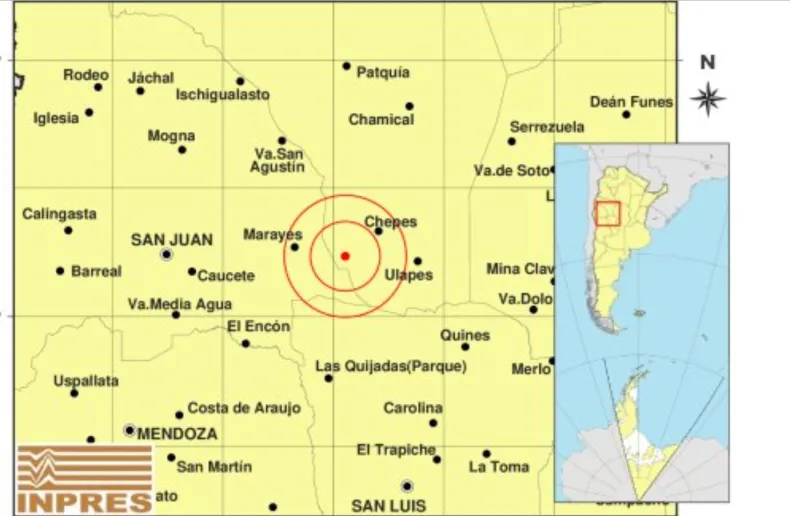 El movimiento telúrico ocurrió a las 14:13:25 (hora local) y tuvo su epicentro a 35 kilómetros al sudoeste de la localidad riojana de Chepes. Además, se ubicó a 155 kilómetros al este de la ciudad de San Juan y a 203 kilómetros al norte de San Luis.