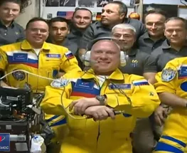 Astronautas rusos vestidos con los colores de Ucrania