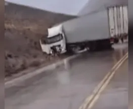 Un camión quedó atravesado en la ruta cerca del ingreso a Horcones en dirección a Chile, provocando el corte total del tránsito. Las lluvias y el pavimento resbaladizo serían las causas del siniestro.
