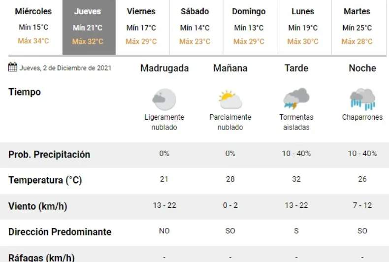 Mientras tanto, este miércoles, la máxima fue de 34° y se alcanzó en la siesta. El cielo estuvo algo nublado y se espera que para la noche esté parcialmente nublado.