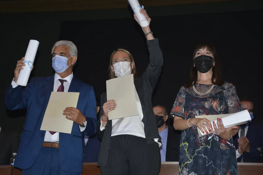 Los tres diputados nacionales Walberto Allende, Fabiola Aubone, por el Frente Todos y Susana Lacar por Juntos por el Cambio, totalmente distendido y acompañados por sus familiares, amigos y partidiarios, fueron recibiendo sus certificados.