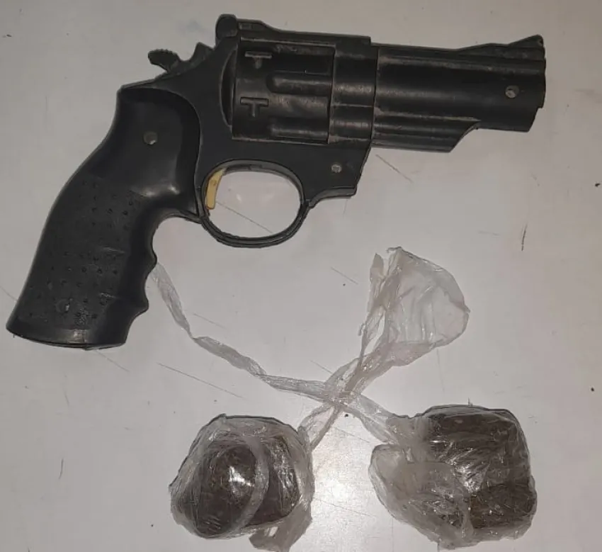 Les secuestraron una réplica de arma de fuego y dos envoltorios de marihuana, que arrojó un peso de 50 gramos.