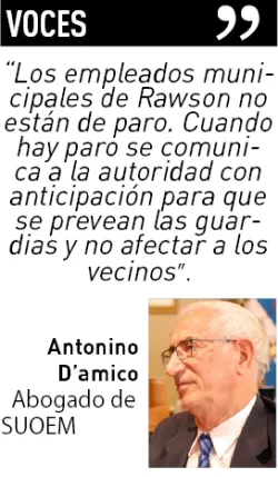 Por su parte, Antonino D’amico, abogado de SUOEM, sostuvo que los municipales de Rawson "no están de paro, cuando hay paro se comunica a la autoridad con anticipación para que se prevean las guardias para no afectar los servicios de los vecinos".