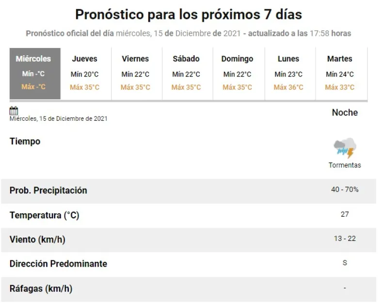 La estimación de la entidad es de 35° de máxima para el jueves, viernes, sábado y domingo. Pero para el martes por la lunes se espera que la máxima sea de 36°. Mientras que para el martes se esperan 33°.
