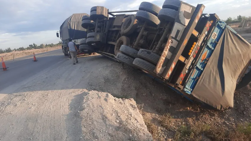 Un acoplado de un camión, marca Volkswagen, dominio AE508ZW, conducido por Alejandro Duarte (27), volcó, quedando de costado sobre la ruta.