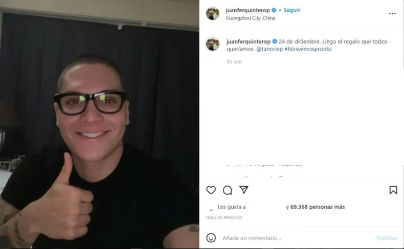 La foto no tiene mucha producción: una selfie con pulgar arriba, y lo que más vale es el mensaje. "24 de diciembre -puso desde China, donde la diferencia horaria es de 12 horas-. Llegó el regalo que todos queríamos". Quintero mencionó a su representante y acompañó con el hashtag "#Nosvemospronto". De inmediato, la publicación de su cuenta de Instagram empezó a llenarse de likes y comentarios de hinchas riverplatenses.