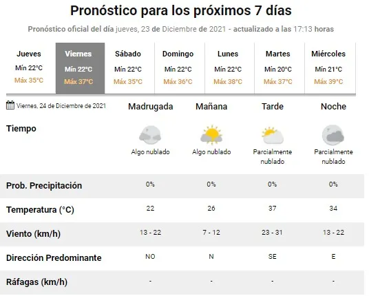 l estima que la mínima será de 22°, mientras que calcula que la máxima será de 37°. Para navidad, la mínima será la misma, pero la máxima estimada es de 35°.