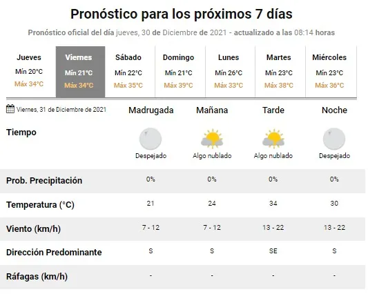 La máxima será de 34° mientras que la mínima será de 21°. Para el sábado ambas mediciones aumentarán un grado. Además se espera una primera semana de enero calurosa.