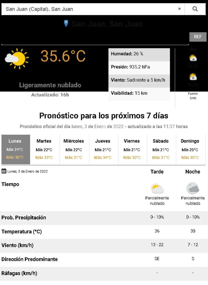 A las 17 ya se alcanzó 35°.6°, muy debajo de los 40° de la semana pasada, pero de todas forma el calor se hace sentir, con una humedad de 26%.