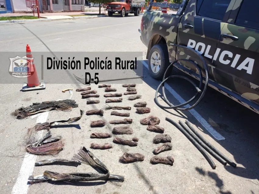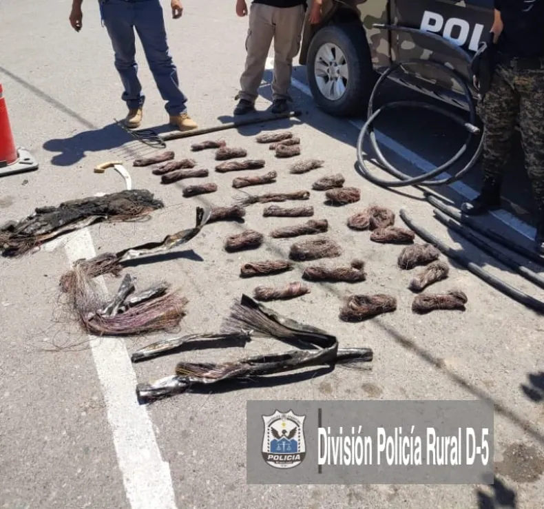 Tras esto, se procedió al secuestro de una gran cantidad de cables de cobre, rollos de cables, tres motosierras, elementos de corte como serruchos, guantes y elementos aptos para corte del tendido eléctrico.