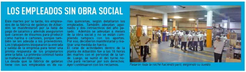 Se agrava la crisis de Tía Maruca con atrasos salariales y sin materia prima. La empresa en concurso desde 2019, debe dos quincenas a sus 350 empleados que pasaron Navidad y Año Nuevo "sin un peso". Hicieron un paro de actividades y revelaron ayer que no hay harina ni insumos para la producción.