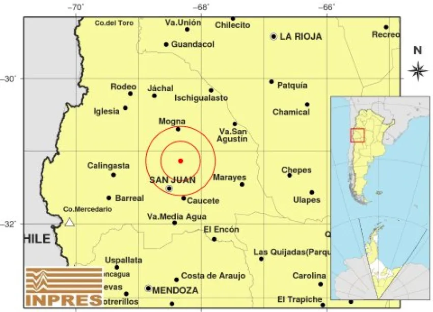 De acuerdo a lo que informa el Instituto Nacional de Prevención Sísmica, el movimiento telúrico se registró a las 19.28 con una intensidad de 3,4°