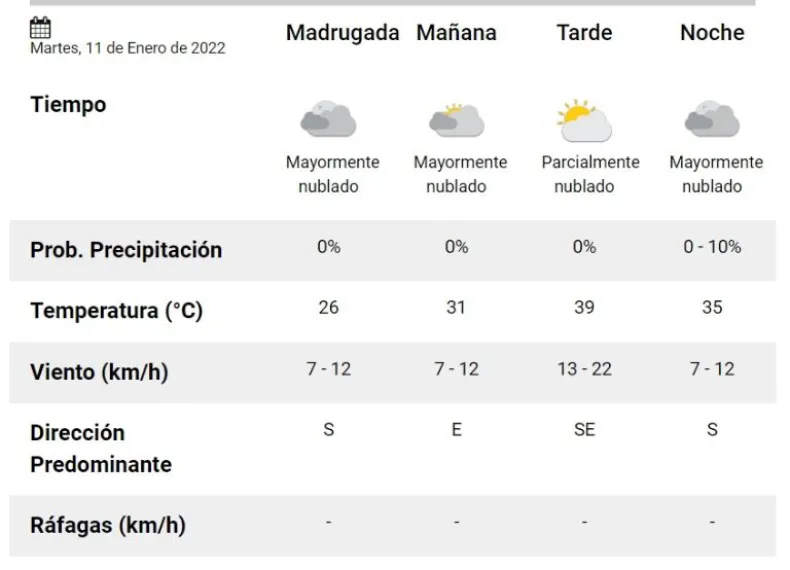 Dese el servicio meteorológico nacional han declarado la alerta amarilla debido a las altas temperatura, situación que se mantendrá en la provincia, sin embargo, se prevé que el cielo se encuentre nublado durante todo el marte con una temperatura que llegará a los 39 grados.