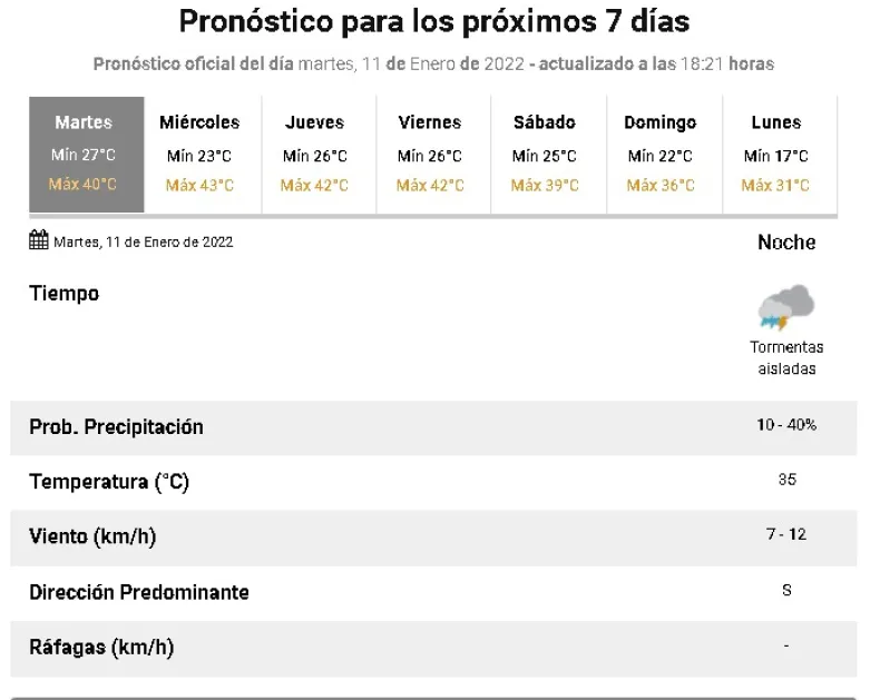 Además, el Servicio Meteorológico Nacional anunció probabilidades de lluvias para la noche de este martes en toda la provincia.