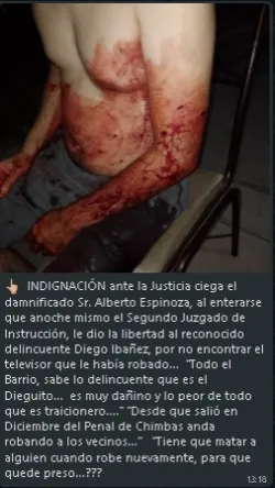 "Todo el Barrio, sabe lo delincuente que es el Dieguito. Es muy dañino y lo peor de todo, es que es traicionero. Desde que salió en diciembre del Penal de Chimbas anda robando a los vecinos. ¿Tiene que matar a alguien cuando robe nuevamente, para que quede preso?", señala el mensaje que viralizaron los vecinos.