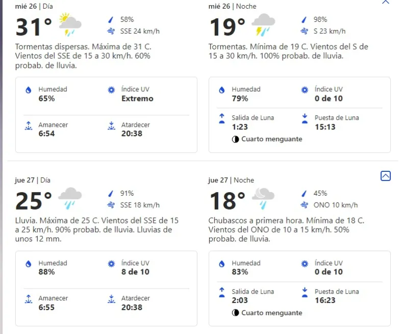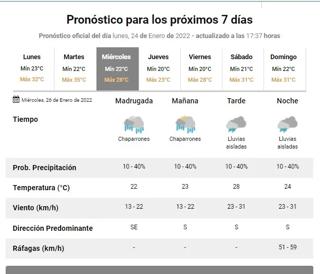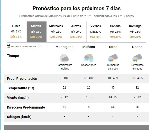 Según la misma pagina para mañana están pronosticados chaparrones para la mañana y tormentas aisladas para la tarde y la noche con una máxima que 35°.