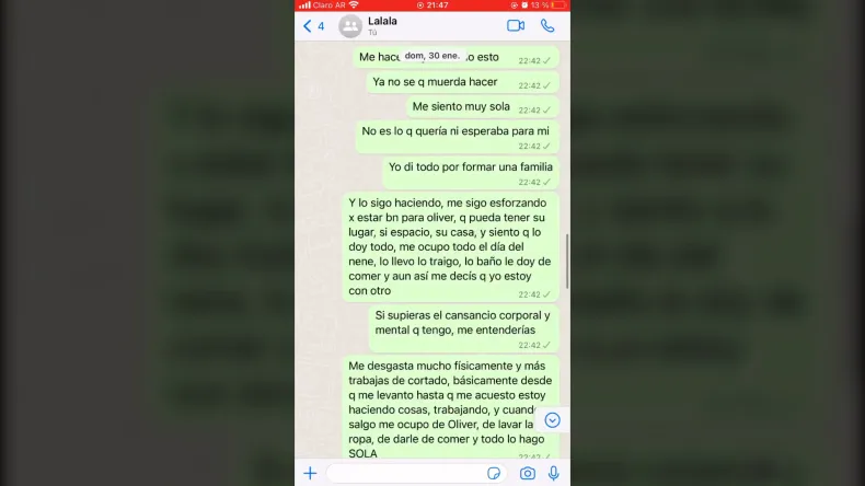 Debido a que su ex pareja ya le rompió dos teléfonos celulares y le borró viejas conversaciones, tal como cuenta ella misma en su publicación, la mujer decidió elaborar un video en el que recopila mensajes amenzantes, fotos de las heridas que padeció por las agresiones físicas sufridas en el último tiempo y un audio que involucra aún más a su ex novio. "La re concha de tu madre, traeme al nene, no lo metás en el medio hija de puta. Porque te voy a re cagar a balazos. Traémelo al nene porque se va a pudrir todo. Re corta te la hago. No metás al nene en el medio", exclama el hombre, en una de sus constantes advertencias para aterrorizar a Emilia.