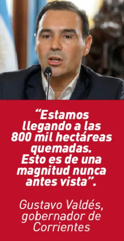 Estamos llegando a las 800 mil hectáreas quemadas. Hay unas 30 mil hectáreas de bosques implantados y 20 mil nativos que fueron arrasadas por las llamas. Ésto es de una magnitud nunca antes vista. Es impresionante lo que está sufriendo la fauna". Con esas palabras el gobernador de Corrientes, Eduardo Valdés definió la situación que se está viviendo en su provincia.