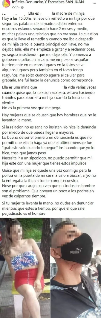 El posteo de un sanjuanino en las redes sociales causa revuelo. Es que afirma que su ex lo goleó cuando fue a llevarle remedios a su hija. Además, afirma que no lo deja vivir tranquilo. Mostró una foto de la mujer y una de él, con golpes en la cara. Afirmó que ya la denunció.