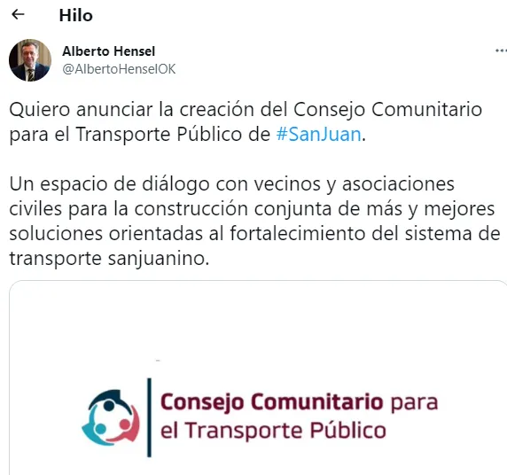 El ministro de Gobierno, Alberto Hensell utilizó las redes sociales para anunciar la creación de un Consejo Comunitario del Transporte Público para San Juan.