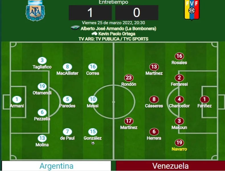 Por su parte, la Vinotinto casi no pisó el área de Franco Armani. El equipo de José Pekerman generó apenas una chance de peligro (un remate de Josef Martínez que pasó cerca), en una situación que fue anulada por off side de Salomón Rondón en la previa.