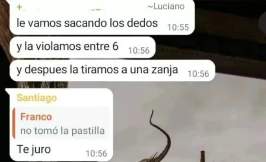 Lourdes expuso a sus compañeros con capturas de pantalla de un chat de WhatsApp que filtró uno de los propios miembros del grupo. En él, los jóvenes, identificados en el mismo chat como Luciano, Santiago, Franco y Fabri, se refieren a "Lourdes" y a una "vieja" (que no fue identificada) con todo tipo de insultos y amenazas. Pero con Lourdes, particularmente, hablan de cómo violarla y luego matarla.