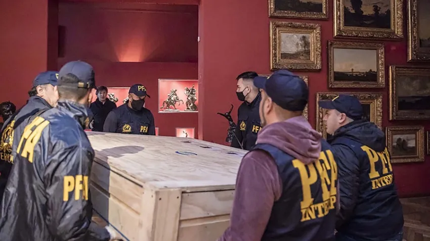 Interpol Argentina coordinó con su par, Interpol Santiago, para contar con el apoyo de la Brigada Investigadora de Delitos Contra la Salud Pública y Medio Ambiente Metropolitana de la Policía de Investigaciones de Chile, para el traslado, servicio de seguridad y entrega de las obras en el aeropuerto del país limítrofe, las que se encontraron debidamente resguardadas en dos cajas de madera, cuyas medidas son de 2,5 m. y un peso aproximado de 100 kg cada una.