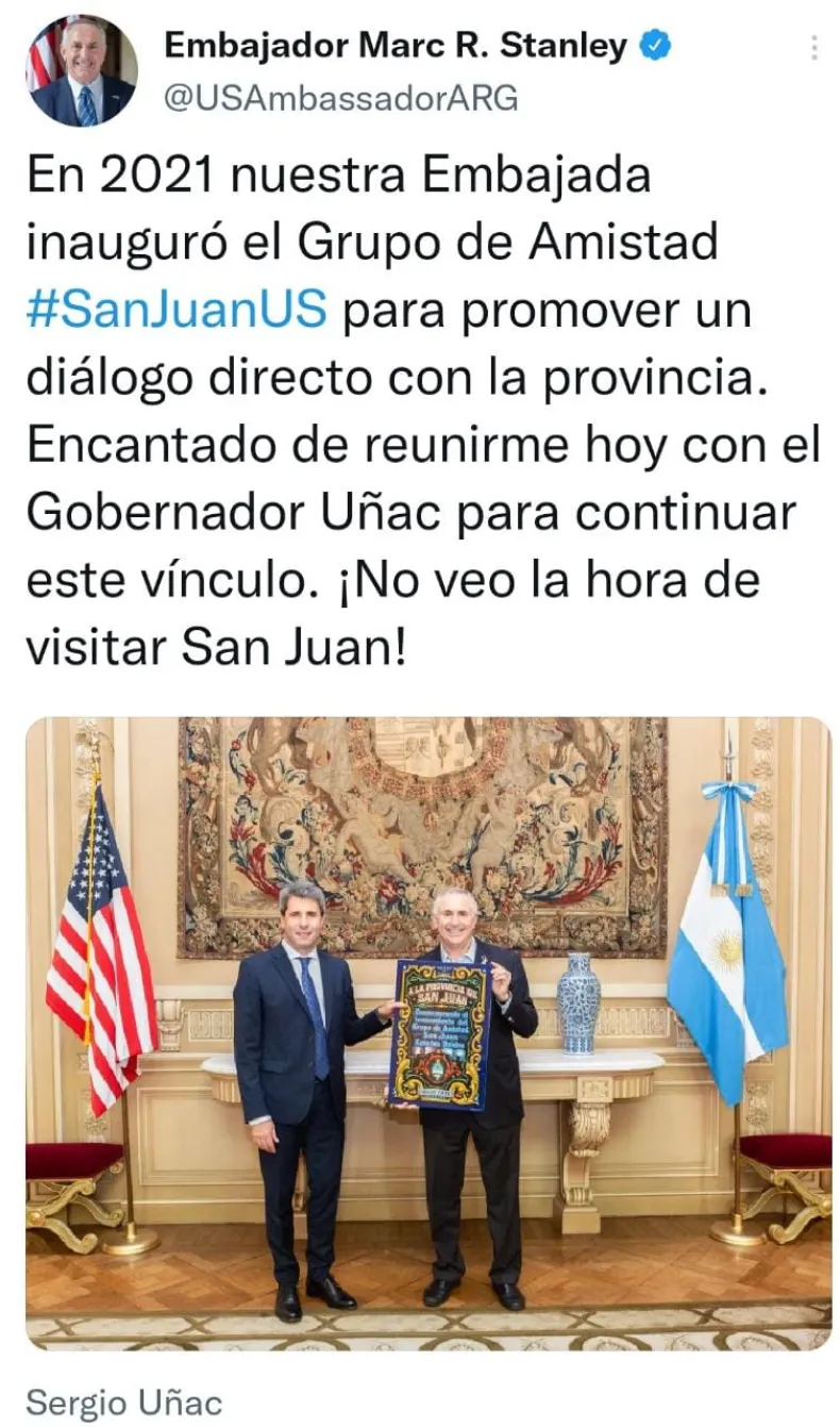 El gobernador de San Juan, Sergio Uñac, acompañado por el secretario de Relaciones Institucionales de la Provincia, Marcelo Fretes, se reunió este martes con el embajador de Estados Unidos, Marc Stanley, quien fue acreditado en enero de 2022.