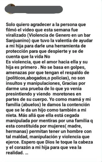 "Solo quiero agradecer a la persona que filmó el video que esta semana fue viralizado, que tuvo la valentía de ayudar a mi hija para darle la herramienta de protección para que despierte y se dé cuenta que la vida No Es Violencia",