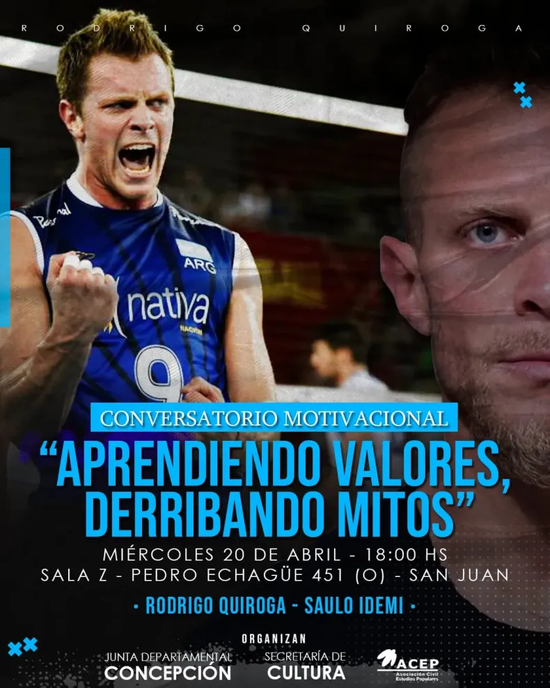 "Aprendiendo valores, derribando mitos", es el nombre del conversatoria que se realiza esta tarde en SJ. Con la organización de la Junta Departamental Concepción, Secretaría de Cultura y ACEP, el voleibolista y empresario Rodrigo Quiroga compartirá sus experiencias.
