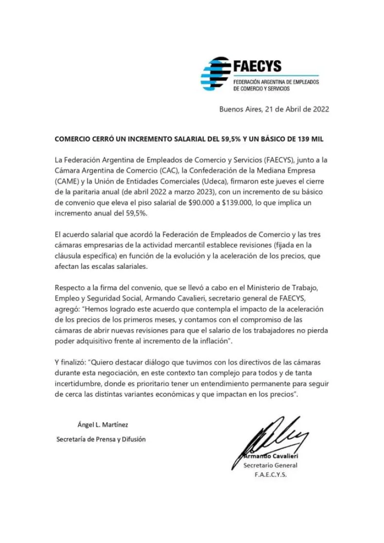 Esto va desde abril de 2022 a marzo de 2023, con un incremento de su básico de convenio que eleva el piso salarial de $90.000 a $139.000, lo que implica un incremento anual del 59,5%.