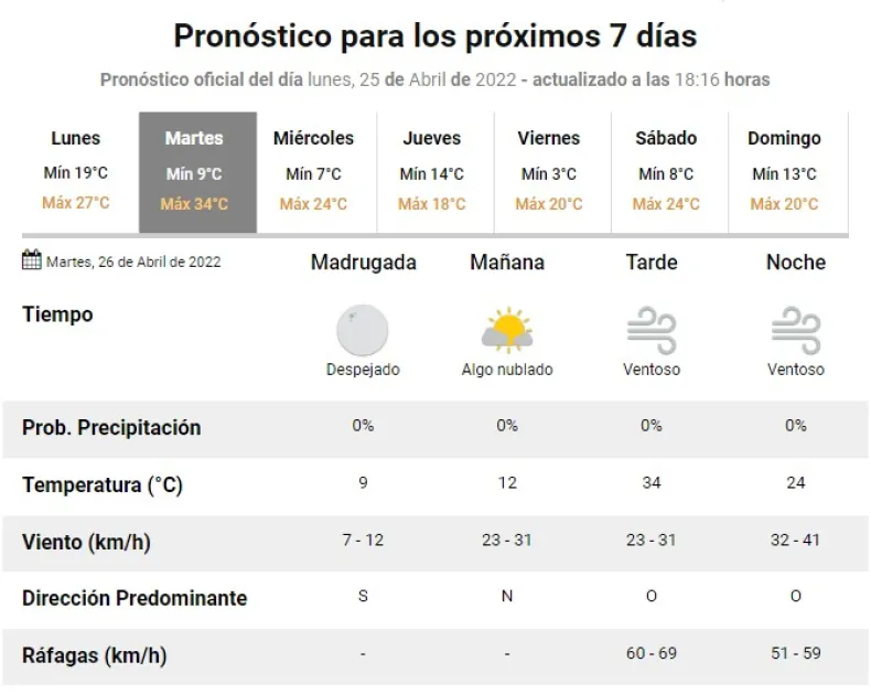 Según lo indicado por el SMN, este martes por al tarde estará ventosos con ráfagas que irán desde los 59km/h hasta los 69km/h. Será más fuerte incluso que el del domingo pasado.