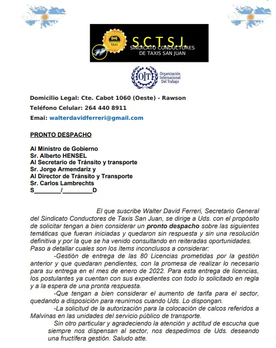 Walter Ferreri, del Sindicato de Conductores de Taxis, adelantó a Zonda Diario que presentará una nota con varios pedidos, entre ellos destaca: "Que tengan a bien considerar el aumento de tarifa para el sector, quedando a disposición para reunirnos cuando ustedes lo dispongan".