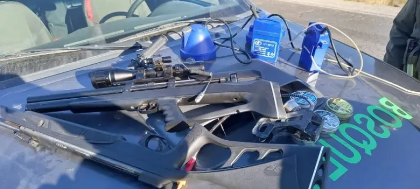 Hallaron una escopeta Brenta calibre 16mm, con un un cartucho Orbe de calibre 16mm y un rifle aire comprimido de 5.5mm. En el rodado también llevaban cuatro liebres del tipo europeo, que habían cazado recientemente.