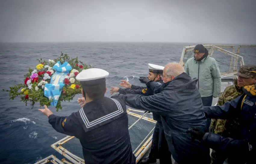 La delegación, que incluyó sobrevivientes, partió del puerto de Ushuaia a bordo del rompehielos ARA Almirante Irizar para homenajear a los "héroes" que perdieron la vida el 2 de mayo de 1982 en la zona en donde fue atacado el crucero durante el conflicto bélico con el Reino Unido: allí se arrojaron flores al mar.