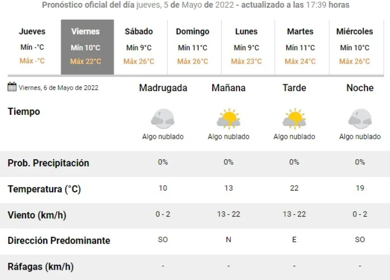 Este viernes, se espera una jornada agradable en materia de tiempo. Es que el Servicio meteorológico Nacional, pronostica una mínima de 10° y una máxima de 22°.