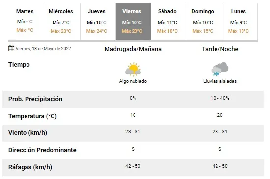 Además, para el domingo se espera una máxima de 15° y para el lunes de 13°.