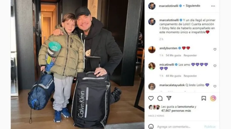 "¡Y un día llegó el primer campamento de Lolo! ¡Cuanta emoción! Estoy feliz de haberlo acompañado en este momento único e irrepetible", escribió Marcelo Tinelli en la publicación en la que posó junto al niño con indumentaria de camping y mochila.