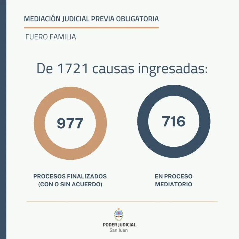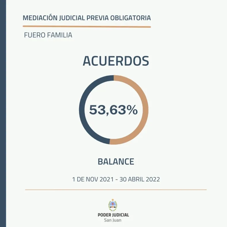 El Centro Judicial de Mediación informó los datos estadísticos que se obtuvieron desde la puesta en funcionamiento de la Mediación Judicial Previa Obligatoria en el fuero de Familia del Poder Judicial de San Juan, arrojando un balance positivo desde el 1 de noviembre 2021 hasta el 30 de abril de 2022, inclusive.