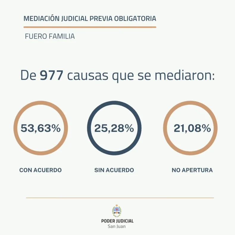 De acuerdo a los datos oficiales, ingresaron 1.721 causas. De esas, 977 llegaron a mediación y hubo acuerdo en el 53,63% de ellas en las que se finalizó el proceso obligatorio; mientras que en el 25,28% no hubo acuerdo y en el 21,08% directamente no se dio lugar a la apertura por inasistencia de las partes o motivos ajenos al sistema, cuyas causas se tramitarán fuera del proceso de mediación en el fuero de Familia.