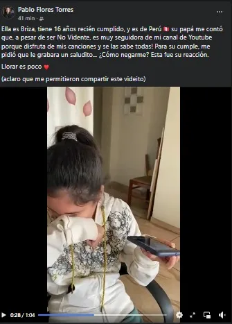 "Ella es Briza, tiene 16 años recién cumplidos, y es de Perú. Su papá me contó que, a pesar de ser No Vidente, es muy seguidora de mi canal de Youtube porque disfruta de mis canciones y se las sabe todas! Para su cumple, me pidió que le grabara un saludito... ¿Cómo negarme? Esta fue su reacción. Llorar es poco ♥", publicó el artista e influencer sanjuanino en sus redes sociales.