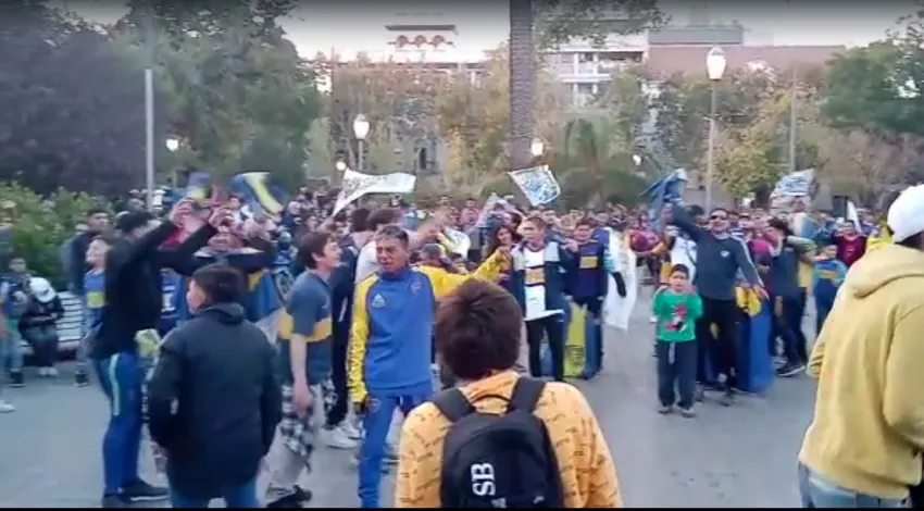 Los hinchas van llegando a la plaza principal de San Juan para celebrar el título número 72 de Boca. Hay alegría total y los hinchas lo demuestran.